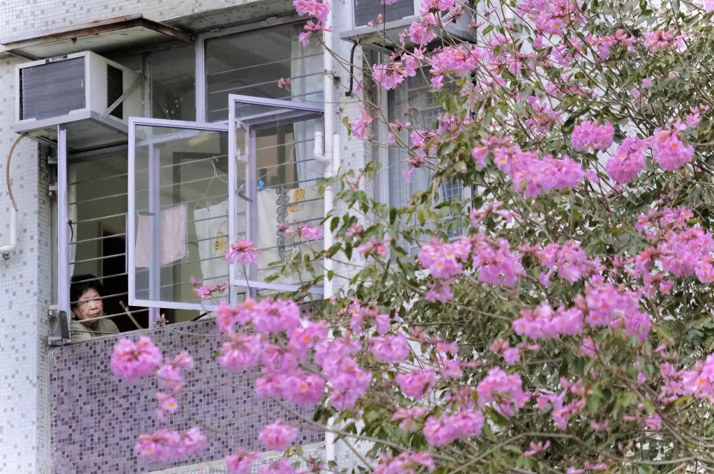 街坊走近窗邊已經可以欣賞紅花風鈴木。
