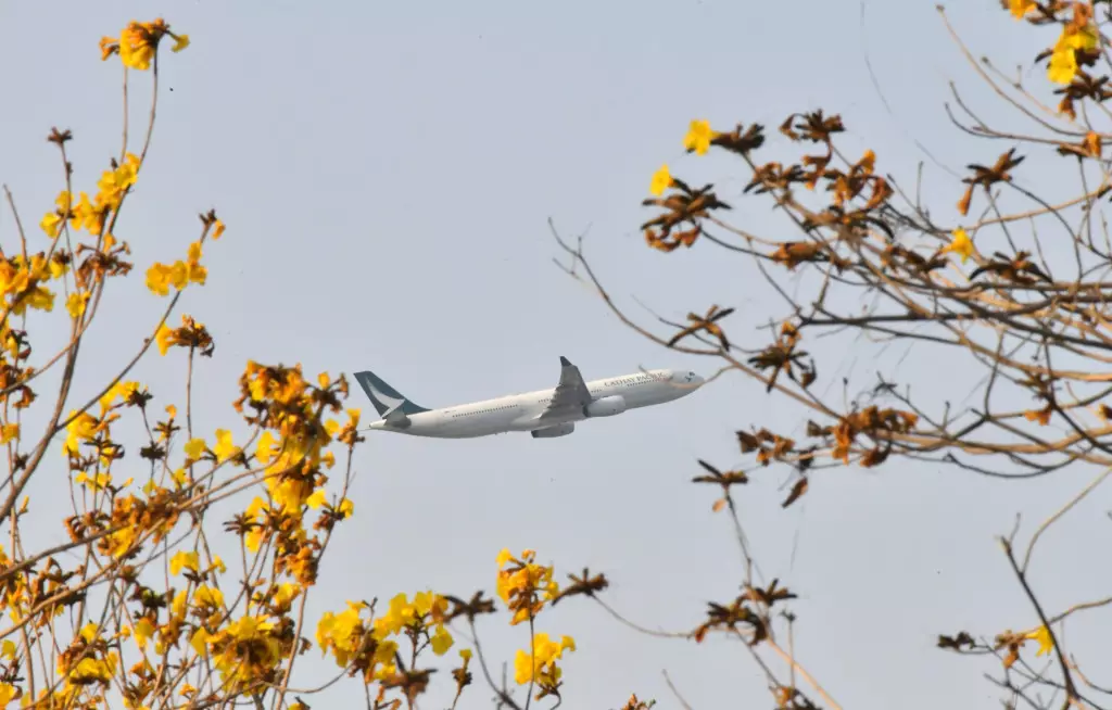 飛機空中航行,與盛開的黃花風鈴木構成一幅畫。