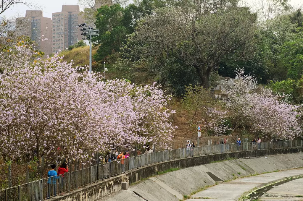 屯門富泰邨明渠旁宮粉羊蹄甲盛放,粉紫色花海被稱「港版河津櫻」。