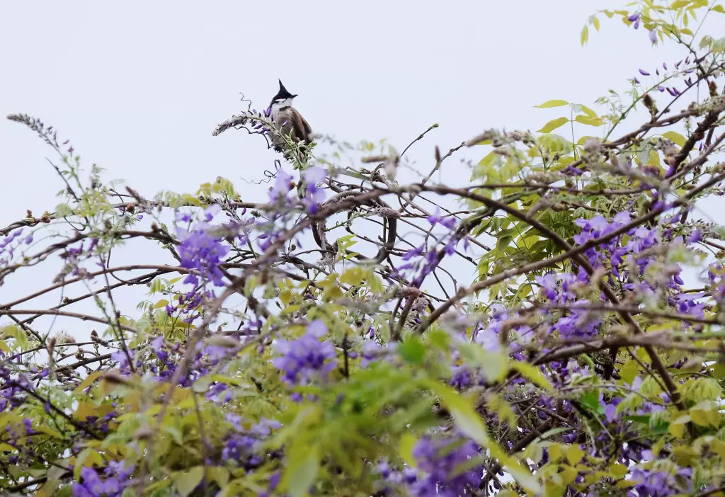 李白描紫藤「紫藤掛雲木,花蔓宜陽春。密葉隱歌鳥,香風留美人」。