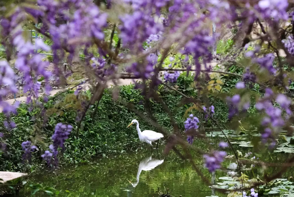 白鷺在紫藤旁邊的荷花池覓食,極具詩意。