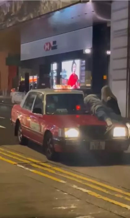 男子突掙脫女友人牽手站在的士車頭。(影片截圖)