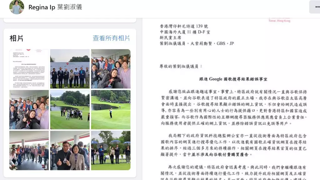 身兼行政會議召集人的新民黨主席葉劉淑儀早前致函創新科技及工業局局長孫東,關注Google拒絕刪除錯誤的國歌資訊,建議政府政策局、部門及非政府公營機構即時停止在Google刊登廣告。她27日晚在社交平台張貼孫東的回覆,稱特區政府會認真考慮建議。