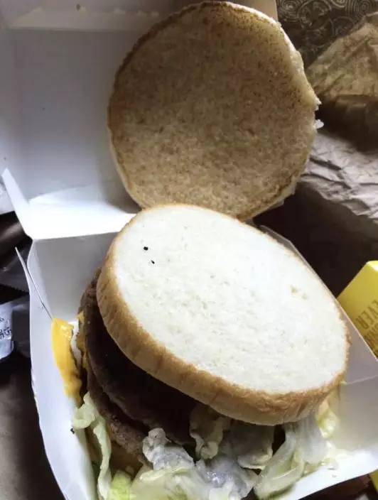 每個人飲食喜好各有不同,到麥當勞買飽可能會選擇走醬、走酸瓜、走洋蔥、走芝士,但鮮少人會連「包」都走埋。近日一網民於社交平台發文抱怨,指近日在麥當勞買了漢堡套餐,回家卻發現漢堡飽少了一片麵包且嚴重漏汁,十分不滿。有網民見了笑言「似跌過落地,執翻之後冇咗底嗰塊包咁喎」。事件引來不少網民分享類似中伏經歷,有些甚至比事主的遭遇更誇張。