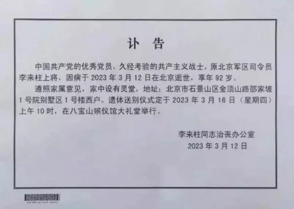新華社報道,正大軍區職離休幹部、原北京軍區司令員李來柱,因病於3月12日在北京逝世,享年91歲。