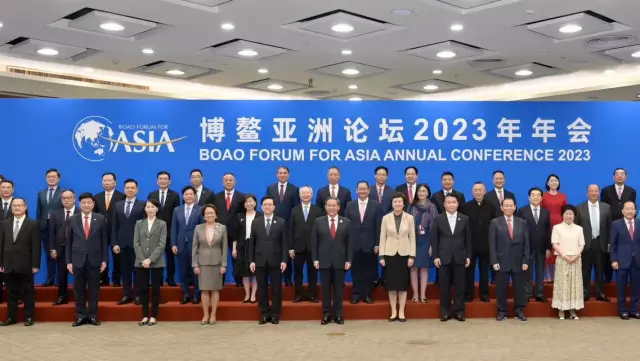 博鰲亞洲論壇2023年年會開幕式,3月30日上午10時在海南舉行,國務院總理李強出席開幕式並發表主旨演講。特首李家超亦有出席活動,合照期間站在前排、李強的身旁。