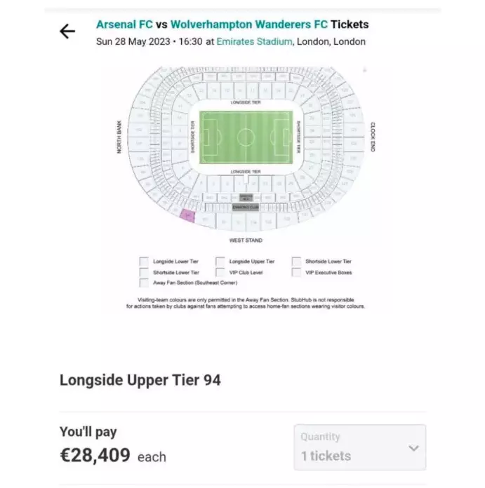 在英超聯賽榜暫時以8分領放的阿仙奴大有機會奪得自2004年以來首座聯賽奬盃,其聯賽最後一戰將於主場迎戰狼隊的門票已在網上火速大賣,現時已在網上出現該仗的門票轉售,最高價格被炒至5萬歐元的天價,折合港幣約38萬。