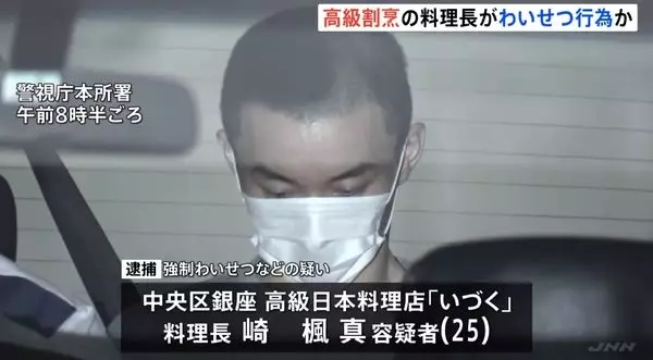 據日媒報道,警視廳於3月27日發表消息,名廚崎楓真涉嫌於1月15日凌晨6點,趁住戶進出時潛入東京都墨田區的自動鎖公寓,並且闖進一名女子房間,對正在就寢的20多歲年輕女子,做出親吻摸胸等猥褻行為。受害女子驚醒後奮力抵抗,崎楓真才離去。女子翌日報案,原來她是崎楓真高中時期的學妹,亦是另一間餐廳的員工。崎楓真被以涉嫌闖入民宅,以及強制猥褻2項罪名被逮捕。