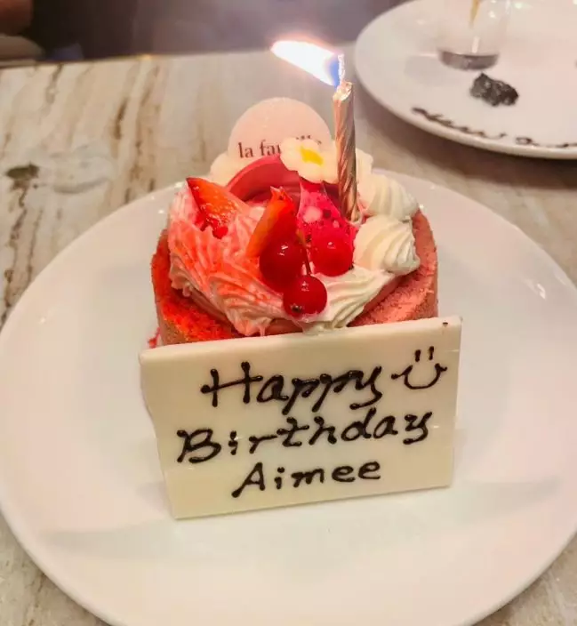 蛋糕上還寫有「Happy Birthday Aimee」。