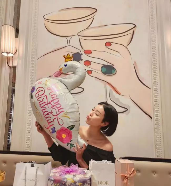 照中見到陳茵媺着上黑色平口上衣,大露香肩,狀態fit到爆,捧着蛋糕微笑影相,蛋糕上還寫有「Happy Birthday Aimee」,陳茵媺又舉起天鵝氣球嘟嘴打卡,少女味極濃,完全不像已經是42歲的人妻!陳茵媺2006年參選港姐奪冠,而曹敏莉與戚黛黛分別是2006年的冠軍及季軍,朱凱婷則是2001年的季軍,全都是三甲人馬,而且至今依然保養得宜,非常省鏡。雖然四人並非同年參選港姐,但一直感情要好,定期有聚會,成為圈中其中一個最索人妻團。