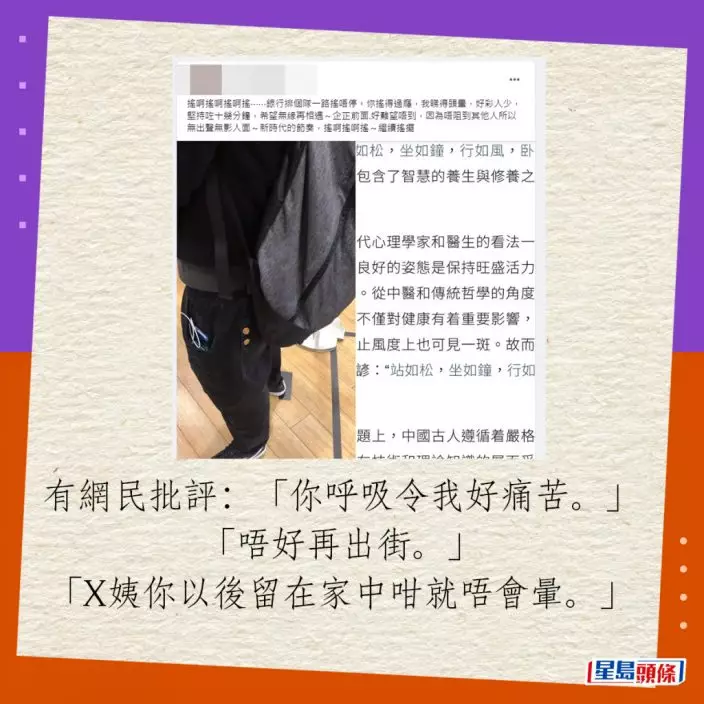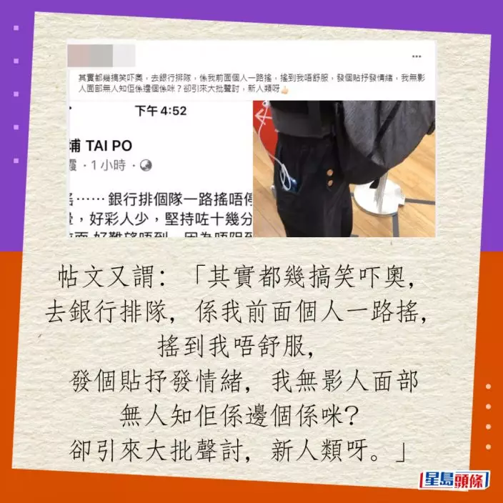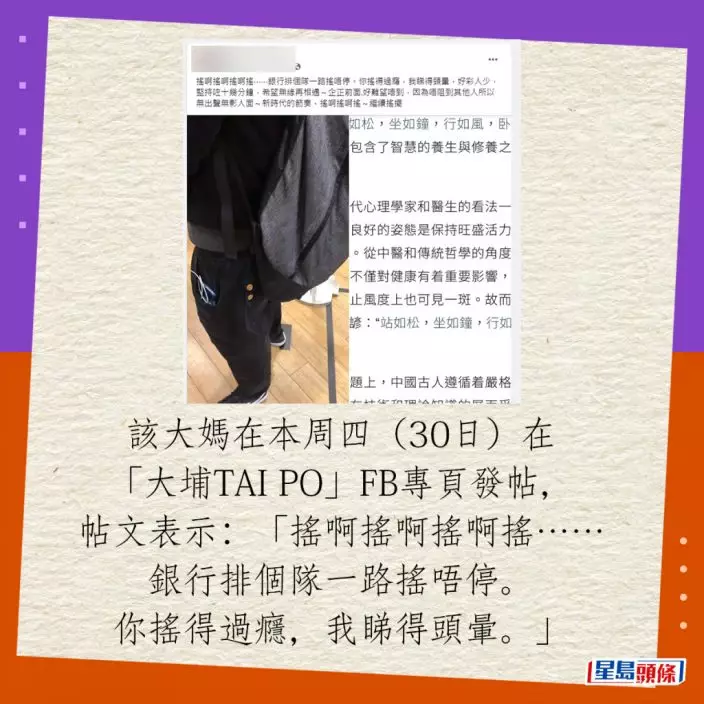 該大媽在本周四(30日)在「大埔TAI PO」FB專頁發帖,帖文表示:「搖啊搖啊搖啊搖⋯⋯銀行排個隊一路搖唔停。你搖得過癮,我睇得頭暈。」