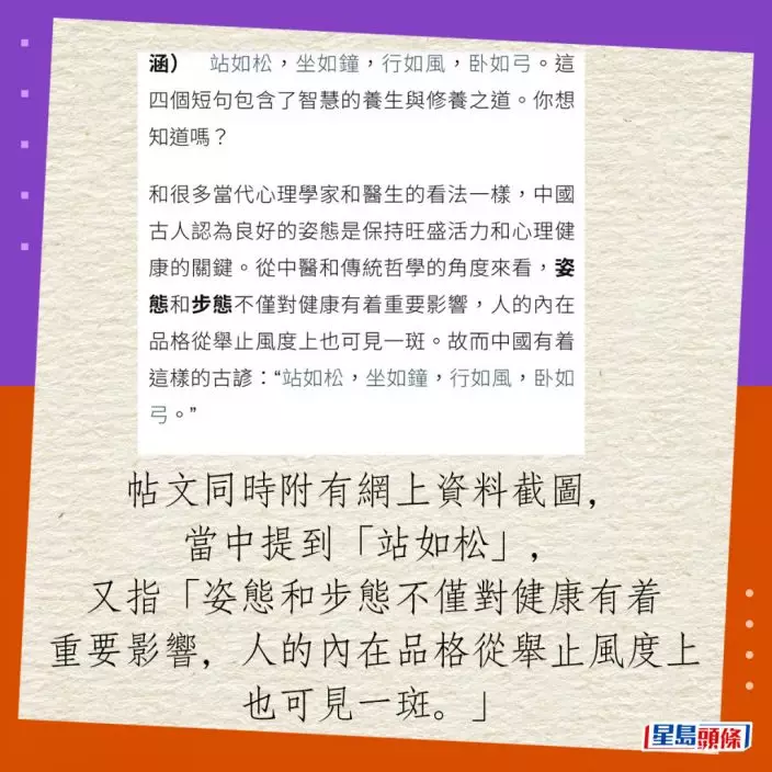 帖文同時附有網上資料截圖,當中提到「站如松」,又指「姿態和步態不僅對健康有着重要影響,人的內在品格從舉止風度上也可見一斑。」