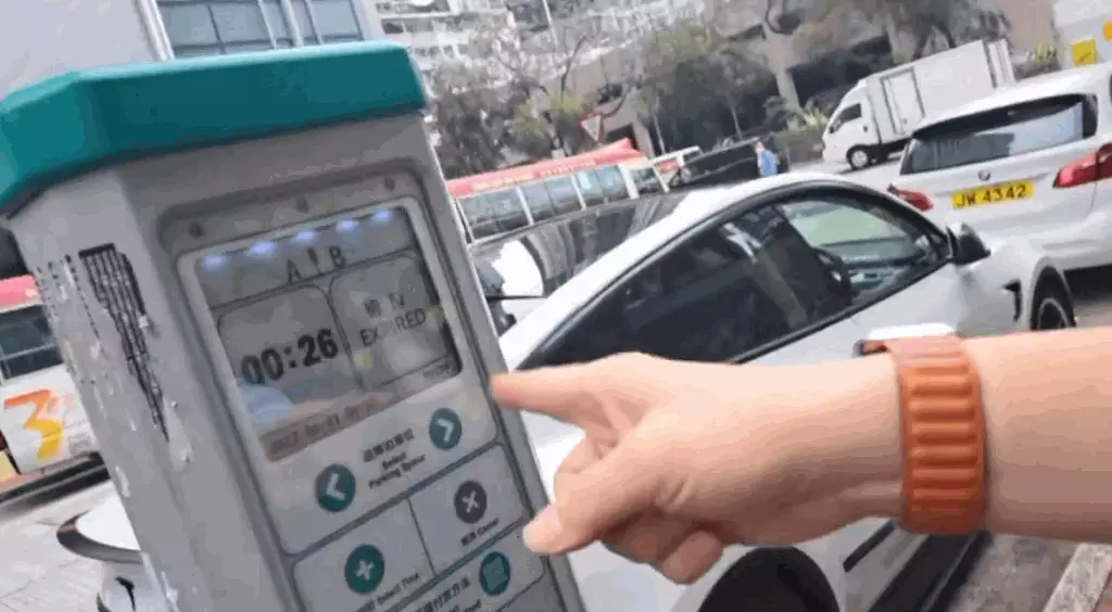 一輛白色Tesla私家車停泊在路邊咪錶位,而咪錶顯示「逾期」。片段截圖