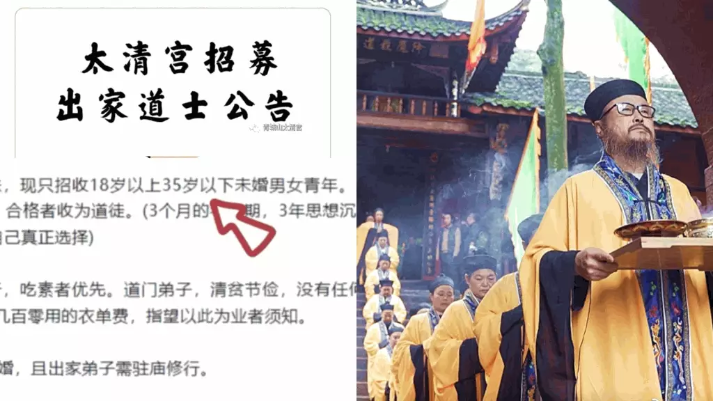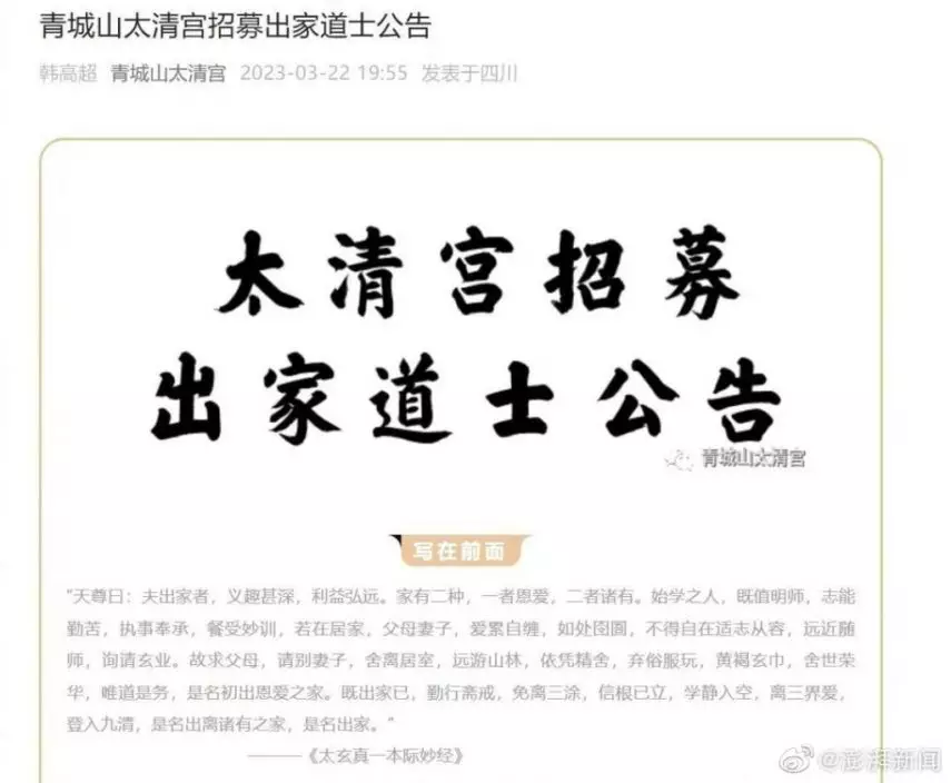 四川青城山太清宮日前發布招募出家道士的公告,引發熱議,招募要求包括限「18歲以上35歲以下未婚男女青年,不能結婚」,有人曲解後批評「年齡歧視」、惡意攻擊。太清宮招募結束後已撤下公告,並閉門謝客。青城派掌門劉綏濱回應有關批評,呼籲各界正確看待和理解。