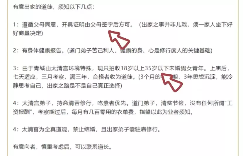 至於不能結婚的要求,是全真教祖師爺王重陽定下的規矩。有關工資報酬,他說道士招募並不是工作招聘,只是對有心向道的人開放,想成為道徒也不是報名就完事,上廟有七天適應期,三個月考察,滿三年經過思想沉淀才正式出家。