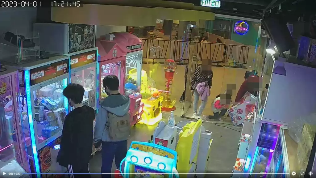 而攝於17時21分36秒至5時22分06秒的短片,一開始時見到女孩、男童和成年男子將目標轉移至店外一部較小型的遊戲機,男子正把遊戲機托起搖動,女孩和男童接著出手幫忙加一把勁,並拍打機頂。