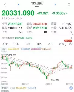 恆指升0.4%或90點收20400點,恆生科技指數漲0.7%,國指漲0.6%。3月,恆指累升3.1%,恆生科技指數累升9.6%,國指累升5.8%,大市成交1405億元。