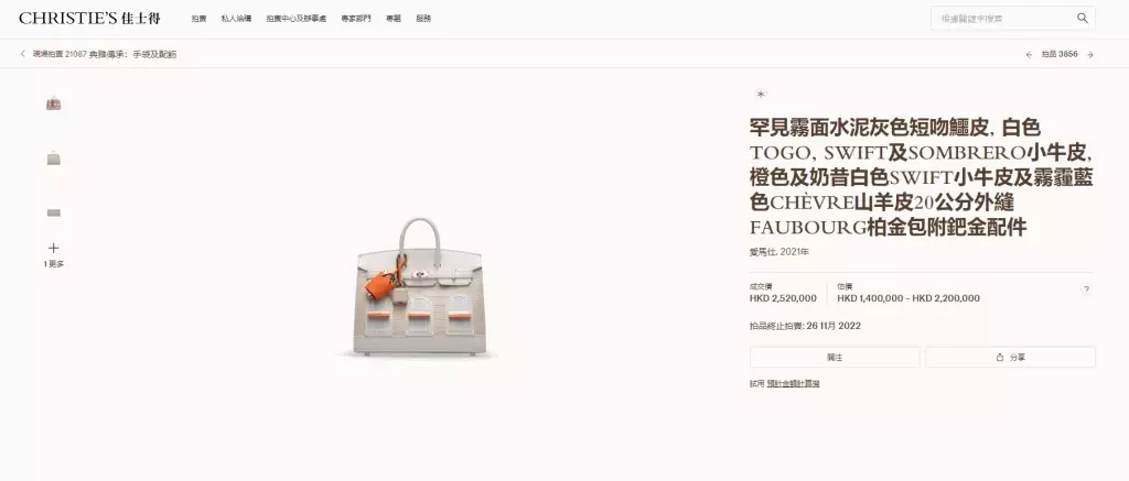 去年同款手袋在佳士得拍賣,成交價高達252萬港元。
