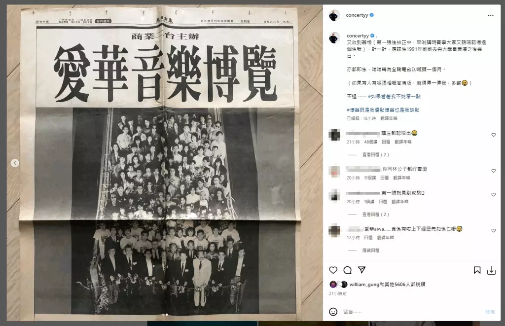 現年53歲的填詞人黃偉文(Wyman)早年曾任職商台DJ,黃偉文於4月4日在IG貼出1991年商業二台主辦的「愛華音樂博覽」廣告照片,驚見當年有頭髮的他似韓國天團BIGBAND成員TOP及林保怡的混合體。雖然照片年代久遠像素模糊,但見到相中除了俞琤、林海峰、葛民輝、林珊珊等商台人物外,還有多位巨星32年前的青澀樣貌,包括四大天王的劉德華、張學友及黎明、林子祥、李克勤、呂方、杜德偉、草蜢等,還有已故陳百強、樂隊BEYOND的黃家駒等。