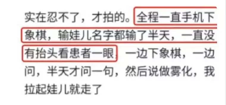 她生氣地說:「我家孩子感冒了帶他去看病,醫生全程都沒有抬頭看我們一眼,輸名字都輸了很久,半天才問一句,最後我看不下去了」,然後氣憤地向醫生說:「你坐在這裡到底是看病還是捉象棋,然後我就不看了,把孩子拉著走了。」