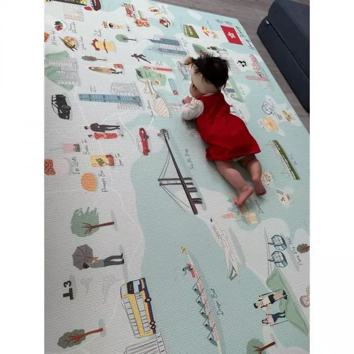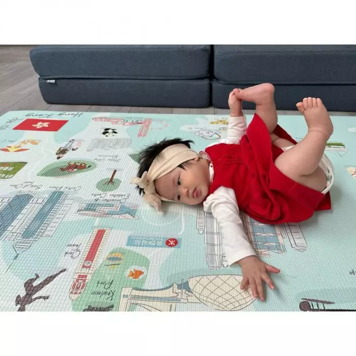 照片見到不夠半歲大的Anika着紅色連身裙坐在兒童餐椅上,頭上還戴着紅色毛毛頭飾,餐桌上放有兩隻碗,好精靈的Anika手上還拿着餐具在玩。而餐椅背後還寫有Anika,看來是囡囡的專屬餐椅,似乎鍾嘉欣已經為細女開始進食固體食物做好準備。另外兩張照片則見到Anika躺在兒童地墊上,而且地墊竟然暗藏玄機,圖案是以香港作主題,即使身在加拿大的鍾嘉欣,似乎也想讓子女從小認識香港。
