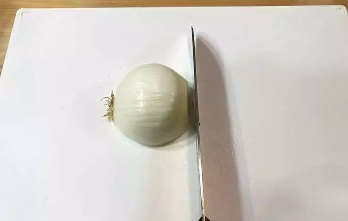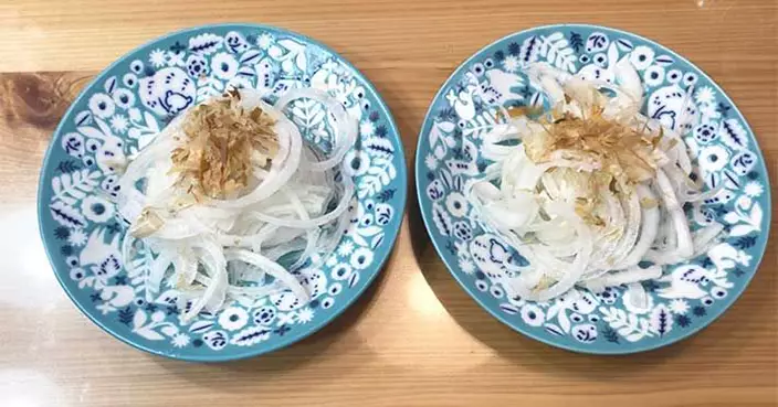 首現將洋蔥切成條狀,再將它們放在盤子上面攤開來靜置,盡量讓每條洋蔥能直接接觸到空氣,就這樣靜置20分鐘,放在空氣裡的洋蔥就可輕松去除辛辣味。