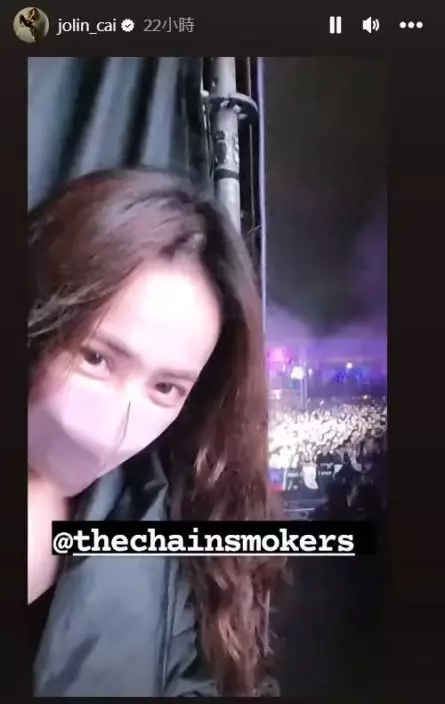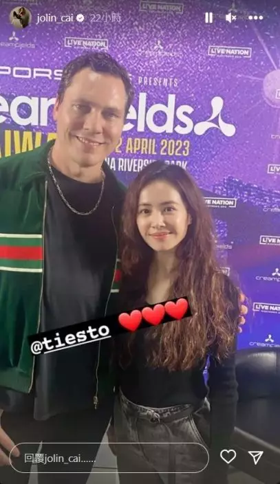 42歲台灣天后蔡依林(Jolin)日前到台北大佳河濱公園朝聖,欣賞英國電音盛事「Creamfields奶油田音樂派對」,活動已有一段長時間沒能到當地演出,今次開騷可謂陣容強大,吸引不少人入場,蔡依林低調睇演出外,更到後台與DJ雙人組The Chainsmokers及Tiësto合照打卡,而且一棄冷艷形象,表情怕醜見含春樣,睇得出她有幾心花怒放。
