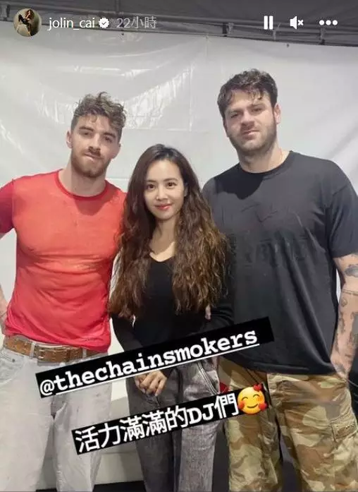 照片中的蔡依林穿上黑色上衣襯牛仔褲,打扮休閒站在舞台側邊欣賞表演,又拍下睇騷的現場情況,另一張照片見到她站在兩位高大壯男The Chainsmokers的身邊合照,即時變成小矮人,不過身形嬌小的她,以淡妝到場,膚質光滑零皺紋,歲月似乎沒有在臉上留痕跡,保養得非常之好又逆齡,她寫道「活力滿滿的DJ們」,而她又「小鳥依人」加甜笑的模樣,獲不少網民讚可愛,又搞笑祝她要勇敢示愛,不排除會有意想不到的恩緣。而另一張照片就與三屆全球百大DJ冠軍、有「電音教父」之稱的Tiësto同框,非常吸睛。