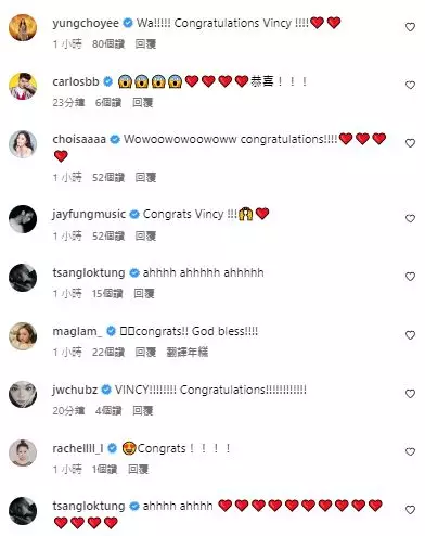 圈中好友容祖兒、蔡卓妍等紛紛驚訝大叫,並留言恭喜對方。