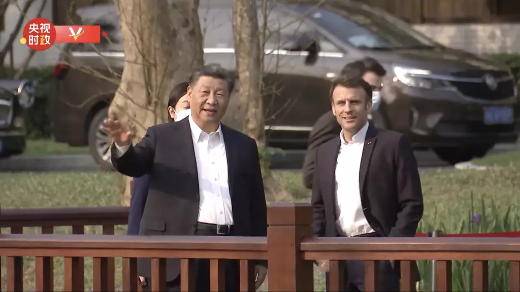 習近平與馬克龍觀賞嶺南庭園風光。央視截圖