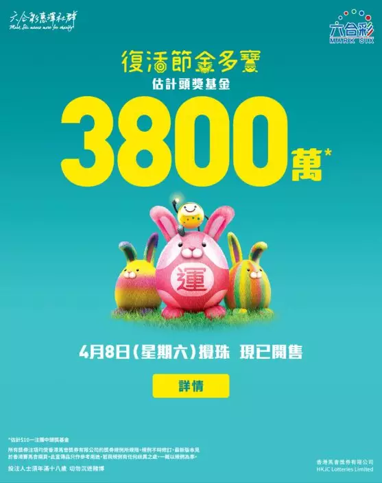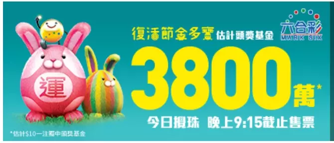 闊別3年的六合彩「復活節金多寶」4月8日攪珠,若以10元一注獨中,估計有機會捧走3800萬元彩金。攪珠8日晚9時30分舉行,截止售票時間為8日晚9時15分。