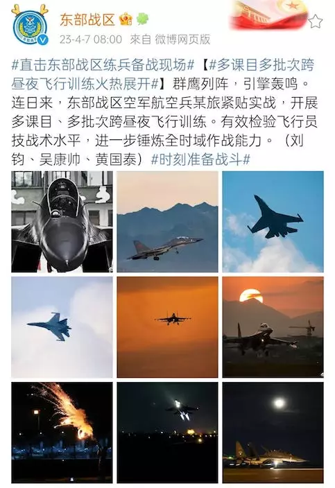 東部戰區昨日在微博更新動態,直擊練兵備戰現場。帖文指,東部戰區空軍航空兵某旅,連日來緊貼實戰,開展多課目、多批次跨晝夜飛行訓練,有效檢驗飛行員技術戰術水平,進一步錘煉全時域作戰能力。並用標籤強調「時刻準備戰鬥」。