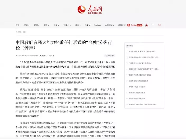 《人民日報》強調中國政府有強大能力挫敗任何形式的台獨行徑。
