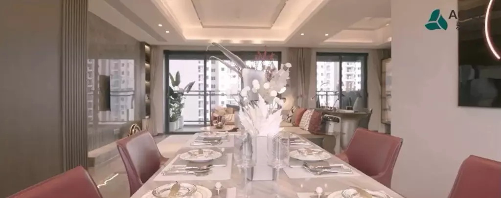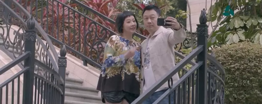片中三人在客廳閒談,可見相當闊落,除能擺放一張L型梳化外,還設有一張單人椅及雲石茶几,牆邊設有一排長櫃,裝修極具氣派。客廳的落地大玻璃令全屋採光度十足,露台則擺放了不少植物,還設有戶外傢具,閒時可以邊喝茶邊遠眺戶外景色,相當寫意。