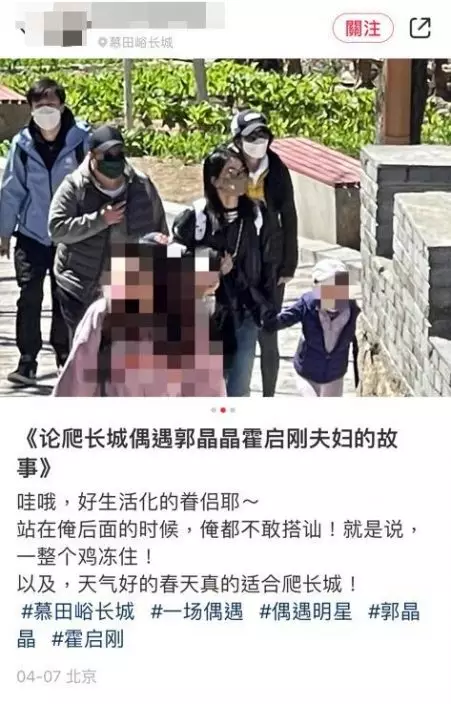 近日正值是復活節假期,霍啟剛和郭晶晶當然外遊享受天倫,有網民在北京長城偶遇霍啟剛一家,當時對方就站在自己身後,令網民心情十分激動,但不敢上前搭訕,他更大讚霍啟剛與郭晶晶是一對很生活化的眷侶!