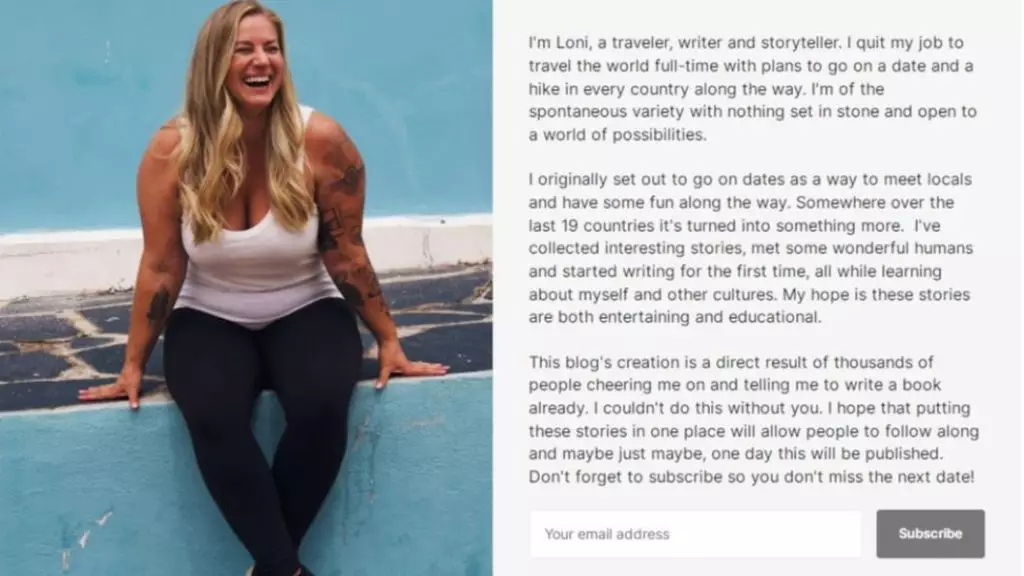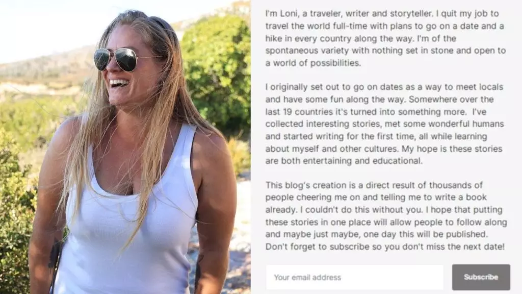 美國40歲單身女子蘿妮‧詹姆斯(Loni James)在母親離世後,於去年3月底開啟一場「尋愛之旅」,她的計劃是「環遊世界」,每到一個國家就與一名當地人約會。在過去一年裡,她遊歷了19個國家,成功完成了34次約會。這些約會經歷有難忘的,也有一些對她來說很糟糕的經歷,而讓她感到神奇的是,與不同國度的男人們聊天後發現他們竟有一個共通點。