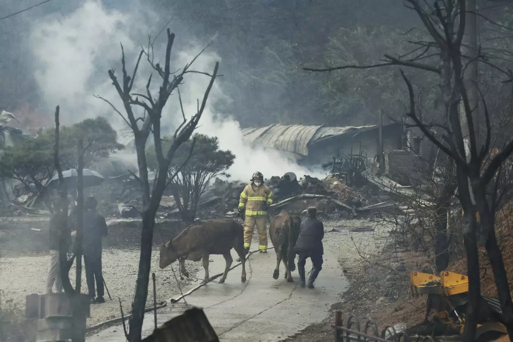 江陵市山林大火,消防員協助當地居民救走牛隻。 美聯社