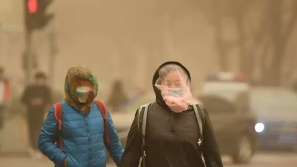 北京市在沙塵天氣下行人都蒙著紗巾出行。新華社圖片