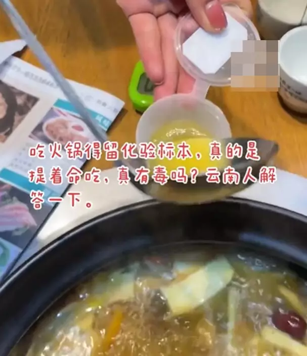 內媒報道,該名遊客姓曹,她日前到雲南吃菌菇火鍋,發現服務員給湯留樣本,曹女稱:「自己去雲南旅遊第一次吃,這邊好像都要留樣,可能是萬一出現什麽問題能及時送去化驗,也能理解這種做法。」