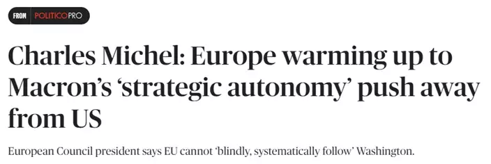 據美國政治新聞網歐洲版「Politico EU」當地時間11日報道,歐洲理事會主席米歇爾(Charles Michel)當日表示,越來越多的歐洲領導人支持馬克龍主張的遠離美國的「歐洲戰略自主」。米歇爾強調,歐盟不能「盲目、系統地跟隨」華盛頓。