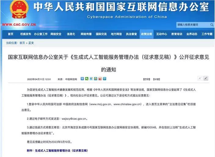 意見稿明確要求生成式人工智能向公眾提供服務前,應按照《具有輿論屬性或社會動員能力的互聯網信息服務安全評估規定》向當局申報安全評估,並按照《互聯網信息服務算法推薦管理規定》履行算法備案和變更、注銷備案手續。