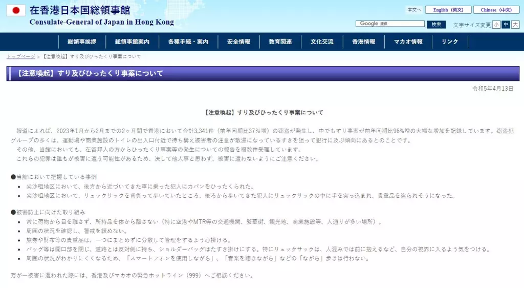 日本駐香港總領事館13日發布特別提醒,引述本港警方數據指今年頭兩個月本港竊案有3341宗,較去年同期上升34%,呼籲日本國民遊港期間應留意財物,又指已經接獲數宗國民在港遇劫求助。