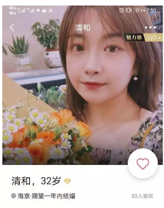 一位在交友軟件上名為「清和」的靚女自稱來自南京,現年32歲,並特意在狀態欄寫道「期望一年內結婚」,相冊還留有數十張美照,看起來非常文藝小清新,氣質超脫。