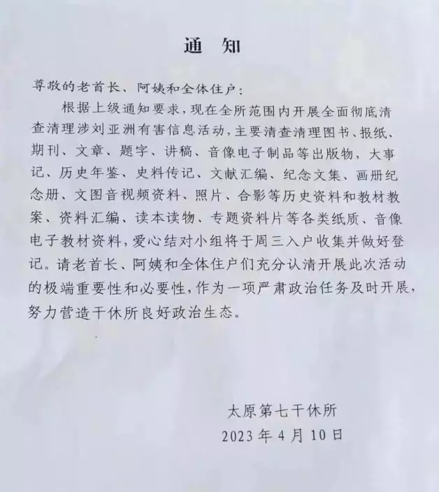 網上流傳要求清理涉及劉亞洲的「有害信息」的通知。