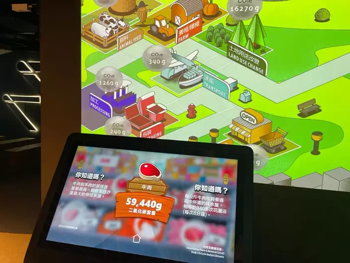 展館的互動遊戲相當有趣,包括了解不同食物的碳足跡,不講不知,原來牛肉的碳足跡最勁,最犀利,二氧化碳排放量有59,440g,吃雞蛋、薯仔和大米就低很多。