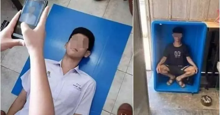 自備藍膠箱的蹲式大法,被網民形容為「人才」。網上截圖