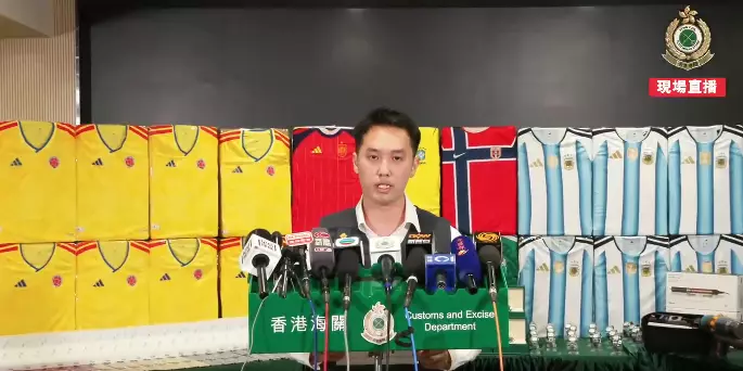 海關上月展開為期三星期的特別執法行動,檢獲的冒牌貨品包括大批懷疑冒牌球衣,共約1萬件,總值400萬元。這些球衣印有世界盃決賽周參賽國家隊的隊徽及相關款式,全部寄往美洲地區。海關形容球衣的造工、質量及仿真度高,相信不法分子是趁今年6月世界盃決賽周舉行期間,應對當地球迷龐大需求,將冒牌球衣轉運到當地出售圖利。