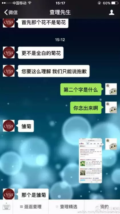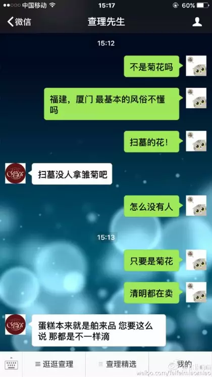 傅小姐非常不滿蛋糕店沒有通知就換成其他花,在微信上要求店鋪「查理先生」解釋。沒想到蛋糕店剛一直狡辯,聲稱那不是白菊花,其後才承認那是雛菊,但堅持掃墓時不會有人拿雛菊,一直不肯道歉。