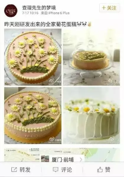 蛋糕店在微博上聲稱近日研發了「全家菊花蛋糕」(網上圖片)