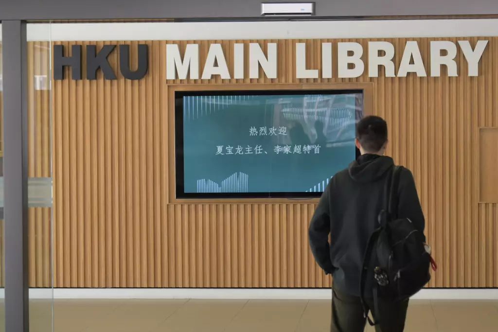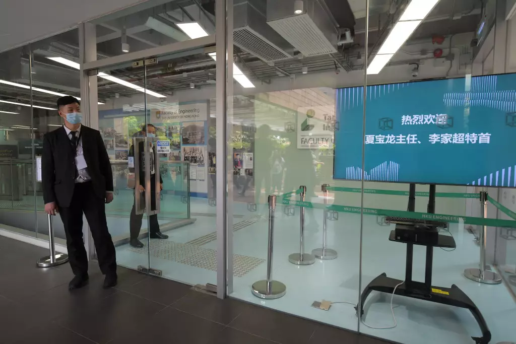 夏寶龍在李家超及官員陪同下,遊覽香港大學。工程學院門口螢幕展示歡迎他們的字句。
